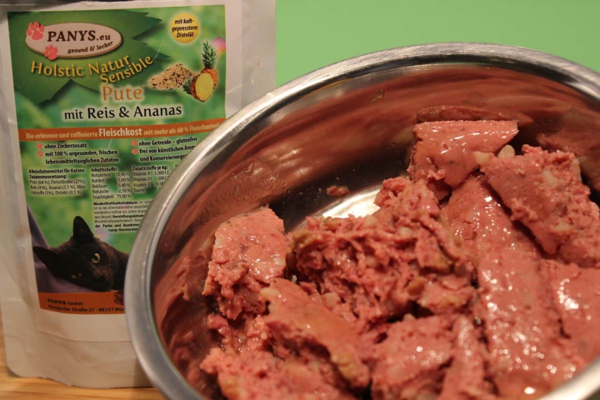 Mit 64,0 % Fleischanteil von der Pute ist dieses Holistic Menü als Alleinfuttermittel für ausgewachsene Katzen super geeignet. Für alle Katzen die kein rotes Fleisch vertragen oder viele Nahrungsunverträglichkeiten haben. Nur 4,0 % Kohlenhydrate in Form von Reis, also eine glutenfreie Rezeptur.  Die Pouchbeutel sind sehr beliebt weil man sie auch für unterwegs bequem mitnehmen kann, einfach aufreißen und rein ins Näpfchen. Da in den Beuteln eine eingearbeitete Brühe ist, hat Ihr Liebling auch gleich noch die notwendige Flüssigkeit, besonders für alle die wenig trinken, gut geeignet. Wenn man dann noch den Beutel mit Wasser ausspült, schmeckt der Katze das Trinkwasser nochmal so gut. Wenn alles erledigt ist, einfach den Pouchbeutel zusammen rollen und ab in den Müll, so hat man wenig Abfall und vor Allem keinen lästigen Dosenmüll. Alle PANYS Menüs im Pouchbeutel gibt es in 95 g und 295 g und sind als Alleinfuttermittel für ausgewachsene Katzen zugelassen. Mit wenigstens 60,0 % Fleischanteil und ohne Zuckerzusatz, sind es ernährungsphysiologisch ausgewogene Rezepturen. Optimale Lagerung: Abstellraum bis 20° C