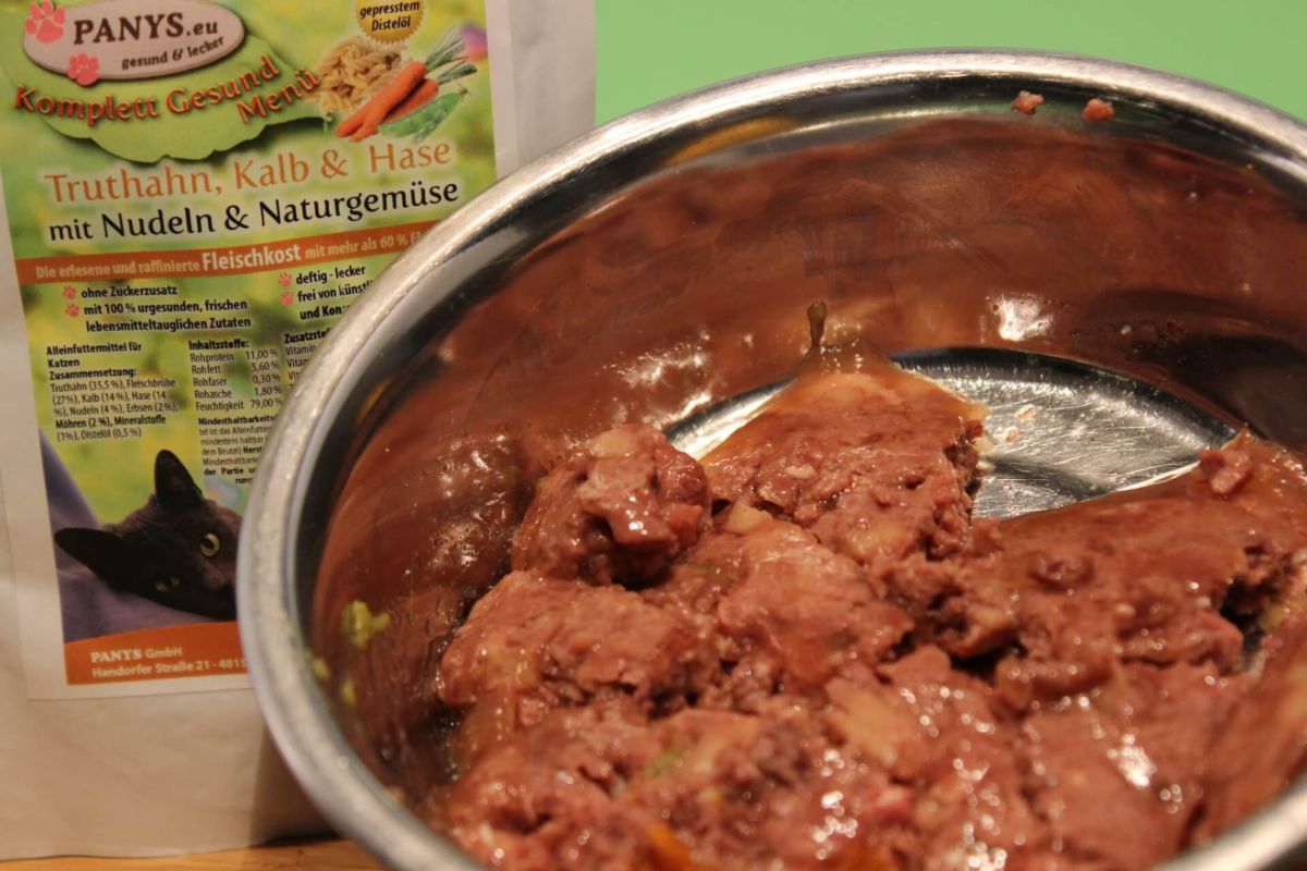 PANYS Menü: Alleinfuttermittel für ausgewachsene Katzen mit 63,5 % Fleischanteil vom Truthahn, Kalb & Hase. Nur 4,0 % Kohlenhydrate in Form von Nudeln - mehr braucht die Katze nicht. Das PANYS Menü: Truthahn, Kalb, Hase, Nudeln und Naturgemüse ist ein erlesenes und raffiniertes Menü mit einem Fleischanteil von 63 % natürlich ohne Zuckerzusatz Mit 100 % leckeren natürlichen Zutaten aus frischen lebensmitteltauglichen Zutaten. Deutsche Qualität ohne zugesetzte künstliche Aroma- und Farbstoffe mit kaltgepresstem Distelöl. Die Pouchbeutel sind sehr beliebt weil man sie auch für unterwegs bequem mitnehmen kann, einfach aufreißen und rein ins Näpfchen. Da in den Beuteln eine eingearbeitete Brühe ist, hat Ihr Liebling auch gleich noch die notwendige Flüssigkeit, besonders für alle die wenig trinken, gut geeignet. Wenn man dann noch den Beutel mit Wasser ausspült, schmeckt der Katze das Trinkwasser nochmal so gut. Wenn alles erledigt ist, einfach den Pouchbeutel zusammen rollen und ab in den Müll, so hat man wenig Abfall und vor Allem keinen lästigen Dosenmüll. Alle PANYS Menüs im Pouchbeutel gibt es in 95 g und 295 g und sind als Alleinfuttermittel für ausgewachsene Katzen zugelassen. Mit wenigstens 60,0 % Fleischanteil und ohne Zuckerzusatz, sind es ernährungsphysiologisch ausgewogene Rezepturen. Optimale Lagerung: Abstellraum bis 20° C