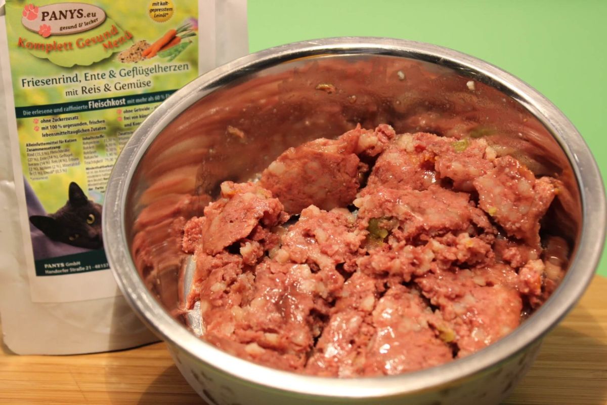 Alleinfuttermittel für ausgewachsene Katzen mit 71,5 % Fleischanteil vom Rind, Herz & Lamm. Super geeignet für alle Katzen, die kein Trockenfutter wollen und keine Kohlenhydrate dürfen oder wollen. Also eine getreide- und glutenfreie Rezeptur. Die PANYS Fleischmahlzeit - Rind, Herz und Lamm... ist ohne Zuckerzusatz und 100 % natürlichen sowie aus frischen lebensmitteltauglichen Zutaten. Deutsche Qualität ohne zugesetzte künstliche Aroma- und Farbstoffe mit kaltgepresstem Distelöl. Die Pouchbeutel sind sehr beliebt weil man sie auch für unterwegs bequem mitnehmen kann, einfach aufreißen und rein ins Näpfchen. Da in den Beuteln eine eingearbeitete Brühe ist, hat Ihr Liebling auch gleich noch die notwendige Flüssigkeit, besonders für alle die wenig trinken, gut geeignet. Wenn man dann noch den Beutel mit Wasser ausspült, schmeckt der Katze das Trinkwasser nochmal so gut. Wenn alles erledigt ist, einfach den Pouchbeutel zusammen rollen und ab in den Müll, so hat man wenig Abfall und vor Allem keinen lästigen Dosenmüll. Alle PANYS Menüs im Pouchbeutel gibt es in 95 g und 295 g und sind als Alleinfuttermittel für ausgewachsene Katzen zugelassen. Mit wenigstens 60,0 % Fleischanteil und ohne Zuckerzusatz, sind es ernährungsphysiologisch ausgewogene Rezepturen. Optimale Lagerung: Abstellraum bis 20° C