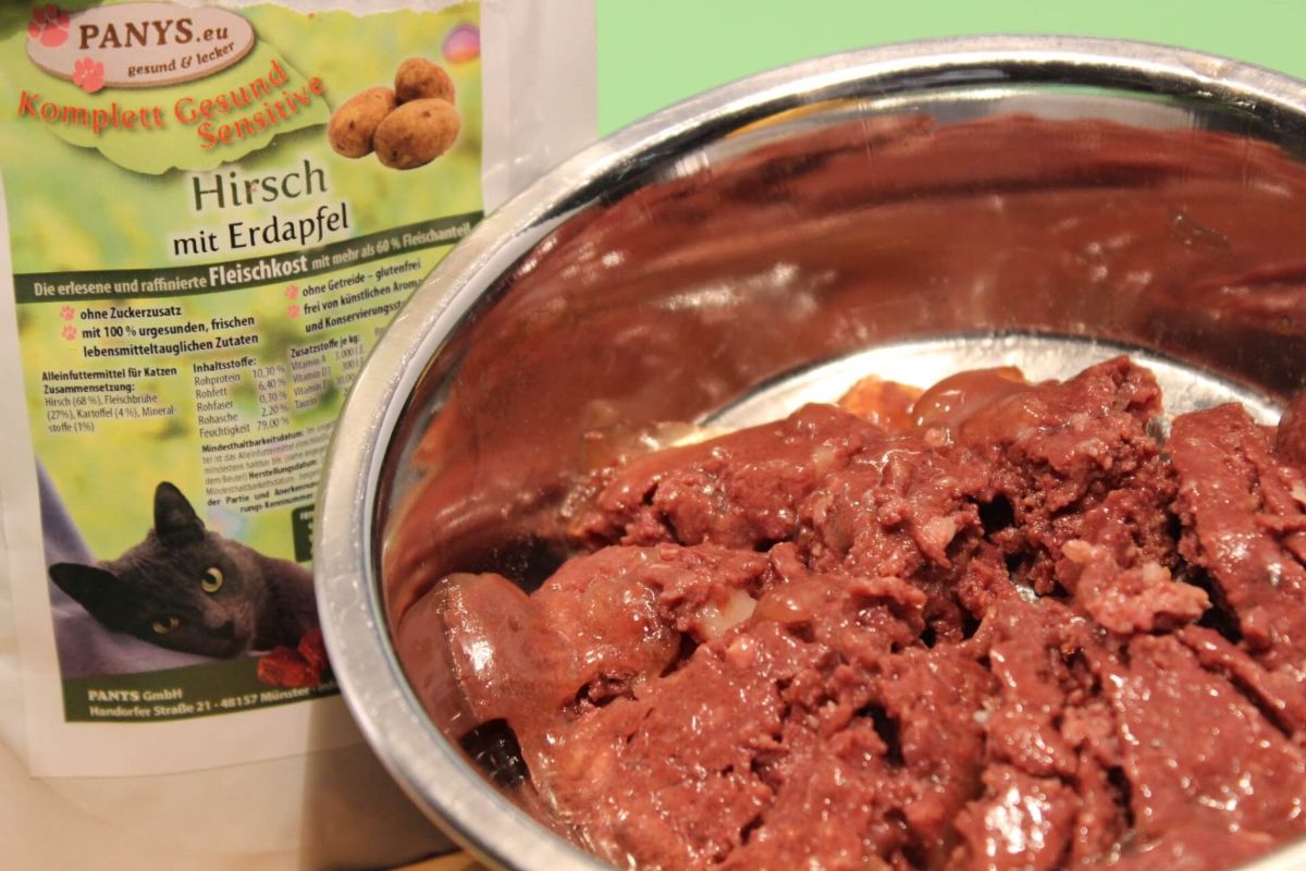 PANYS  Sensitive hergestellt in Deutschland aus lebensmitteltauglichen Rohstoffen ist unser Menü Hirsch und Erdapfel. Ein Alleinfuttermittel für ausgewachsene Katzen mit 68,0 % Fleischanteil vom Hirsch. Super geeignet für alle die kein weißes Fleisch vertragen oder andere Nahrungsunverträglichkeiten haben. Nur 4,0 % Kohlenhydrate in Form von Erdäpfeln, also auch in diesem Menü eine glutenfreie Rezeptur.  Die Pouchbeutel sind sehr beliebt weil man sie auch für unterwegs bequem mitnehmen kann, einfach aufreißen und rein ins Näpfchen. Da in den Beuteln eine eingearbeitete Brühe ist, hat Ihr Liebling auch gleich noch die notwendige Flüssigkeit, besonders für alle die wenig trinken, gut geeignet. Wenn man dann noch den Beutel mit Wasser ausspült, schmeckt der Katze das Trinkwasser nochmal so gut. Wenn alles erledigt ist, einfach den Pouchbeutel zusammen rollen und ab in den Müll, so hat man wenig Abfall und vor Allem keinen lästigen Dosenmüll. Alle PANYS Menüs im Pouchbeutel gibt es in 95 g und 295 g und sind als Alleinfuttermittel für ausgewachsene Katzen zugelassen. Mit wenigstens 60,0 % Fleischanteil und ohne Zuckerzusatz, sind es ernährungsphysiologisch ausgewogene Rezepturen. Optimale Lagerung: Abstellraum bis 20° C